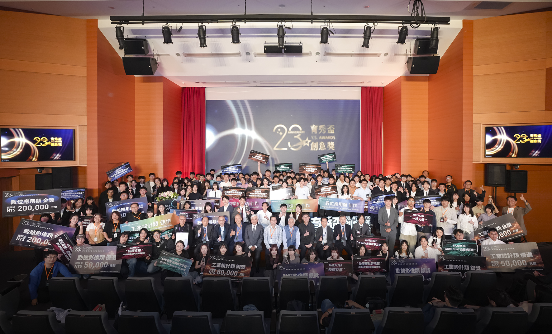 圖說:第23屆育秀盃創意獎決賽暨頒獎典禮精彩落幕,貴賓與獲獎團隊齊聚合影,共同見證青年創新成果綻放。